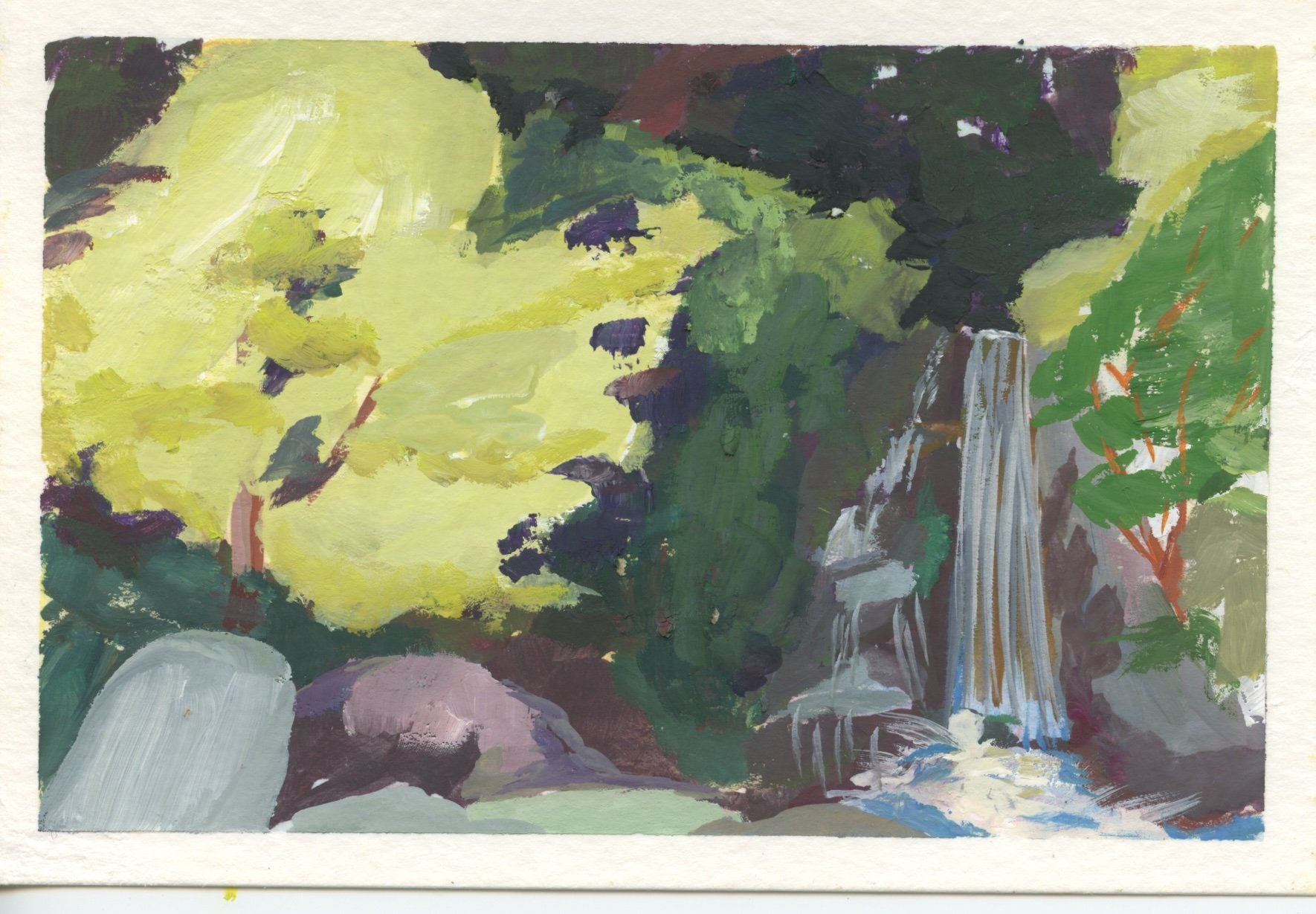 High key waterfall scene. I liked the deep and dark background with high key brightly lit trees in front. Painted at the Arboretum in Pasadena, I think.